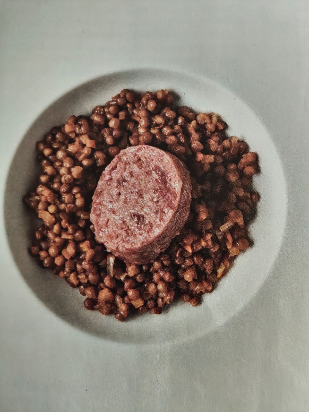 Nel frattempo cuocete il cotechino come indicato sulla confezione e tagliatelo a fette spesse, Eliminate le foglie di salvia, e servite le lenticchie accompagnandole con le fette di cotechino, completando con un filo di olio a crudo.