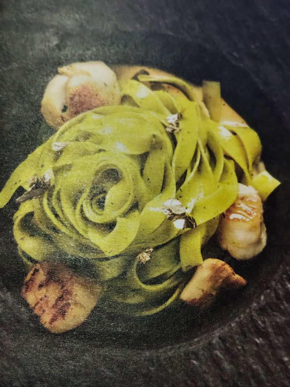 Cuocete le tagliatelle in acqua bollente salata, scolatele al dente, e trasferitele nella padella con le capesante. Aggiungete il burro di basilico, e mantecate a fuoco dolce. Completate a piacere con una macinata di pepe e servite con qualche goccia di maionese di corallo.